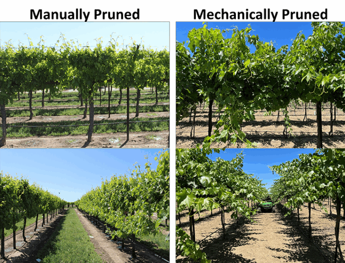 Mechanized pruning in grape production aims to improve productivity by means of uniformity, timeliness and cost effectiveness. It also helps to address the farm labor shortage situation facing the grape industry. The difference in the outcomes of manual and mechanized pruning from the viewpoint of pesticide spray application to grapevines is minimal to nonexistent. Figure 1 shows examples of manually pruned versus mechanically pruned grapevines, indicating similarity in appearance. In both cases, the vine canopies undergo the same temporal changes, from non-foliated canopies at the beginning of the production season to fully foliated canopies later in the season.