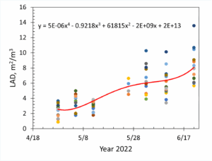 As the number of leaves increase inside the canopy, the leaf area density (LAD) also increases. LAD, with units of square meters per cubic meter, is defined as the total leaf area (m2) per unit volume of canopy (m3). LAD represents the available leaf area in the target canopy that applied spray should deposit on. Figure 2 shows an example of the temporal variation of LAD in canopies of a of manually pruned grape over part of the season. Increasing LAD trends figure are attributed to rapid increase in canopy foliage as leaves form while decreasing LAD trends can be attributed to spreading out of the canopy due to limb elongation during the vegetative stage or gravitational effect as leaves and fruits weigh down on branches.