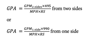 where GPA is gallons applied per acre, GPM2 sides and GPM1 side are the total flowrates (in gallons per minute) from all open nozzles, MPH is the calibrated forward speed (miles per hour) of the sprayer, and RS is the vine row spacing (feet).