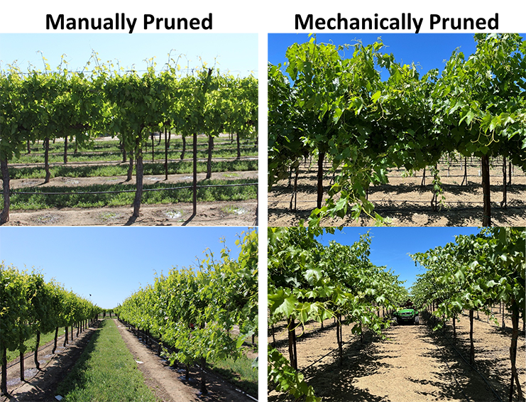 Mechanized pruning in grape production aims to improve productivity by means of uniformity, timeliness and cost effectiveness. It also helps to address the farm labor shortage situation facing the grape industry. The difference in the outcomes of manual and mechanized pruning from the viewpoint of pesticide spray application to grapevines is minimal to nonexistent. Figure 1 shows examples of manually pruned versus mechanically pruned grapevines, indicating similarity in appearance. In both cases, the vine canopies undergo the same temporal changes, from non-foliated canopies at the beginning of the production season to fully foliated canopies later in the season.