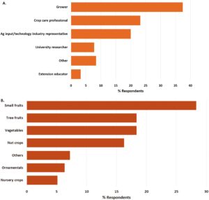 Among Oregon and Washington respondents, 64% identified as growers and 11.5% as crop care professionals. The majority worked with berry crops, while others represented nursery plants, vegetables, ornamentals and various other horticultural commodities.