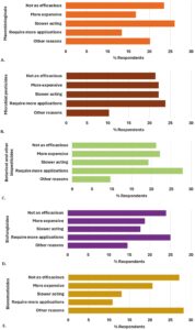 Despite this awareness and usage, satisfaction levels were mixed. Only 11% of respondents reported being “very satisfied” with biopesticides, while 45% were “somewhat satisfied.” Dissatisfaction was attributed to several key factors: lower efficacy compared to synthetics, higher costs, slower action, the need for repeated applications, limited residual activity, narrow pest or crop specificity, environmental sensitivity and a lack of training or technical knowledge.