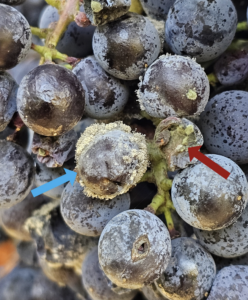Figure 3. Mixed A of Botrytis (blue arrow) and Cladosporium (red arrow) colonizing the same cluster. (Photo credit: C. Starr)