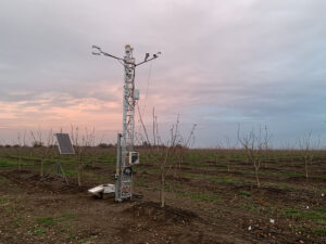 Research installation at the 152-acre orchard began in early 2023. Separate eddy covariance towers were installed in each orchard to directly measure ET. In addition, 36 12-foot neutron probe access tubes were installed at four randomly selected locations in each orchard—72 total—allowing us to monitor soil moisture from the surface down to 10 feet. Installation was completed by September 2023.