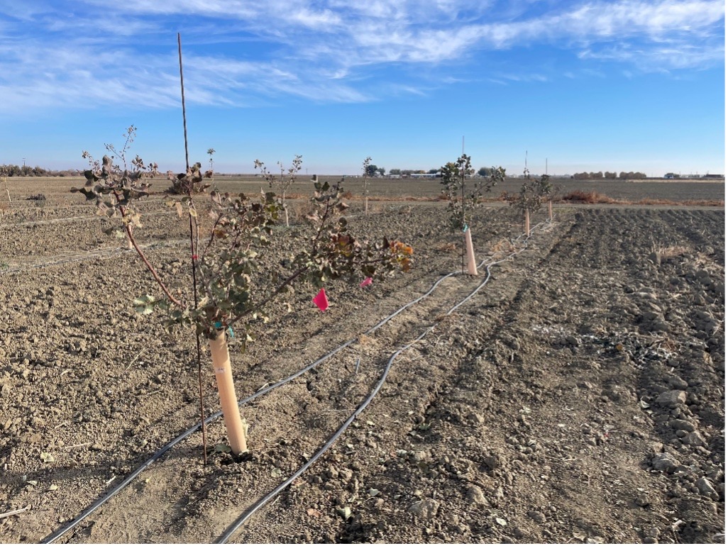 I established three different experimental locations to examine both nitrogen and phosphorus fertilization rates. The first orchard was at the Westside Research and Extension Center near Five Points, California, using nursery grafted Golden Hills on UCBI and planted in April 2023 (Fig. 1). The soil is a clay loam and has a soil organic matter level of 2.15% in the top foot of soil. Soil phosphorus levels are very low, less than 5 ppm, and nitrogen levels in the irrigation water are negligible.