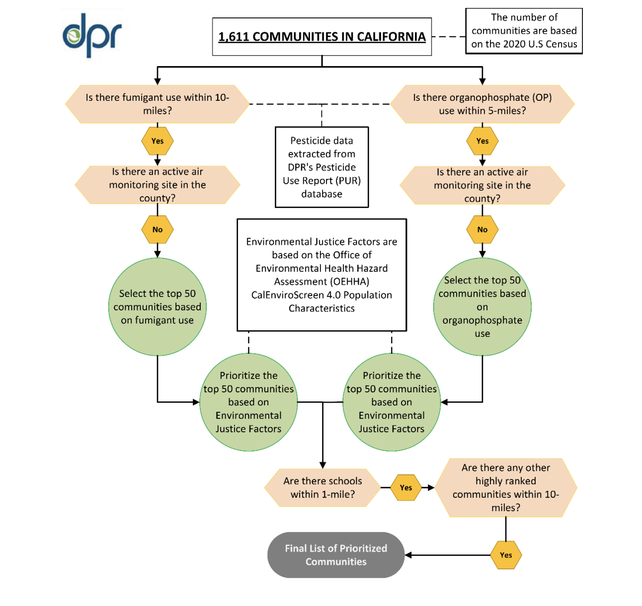 Flow chart of prioritization procedure. The chart identifies the decision pathway for communities to be included in the final list of prioritized communities; communities not meeting one or more criteria are not included on the final list (Source: California Department of Pesticide Regulation.)