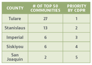 After the initial evaluation, CDPR generated a list of 71 unique communities distributed across 14 counties. After further analysis reviewing existing sites and distances from these sites, the list has been reduced to 29 communities across five counties including Stanislaus, San Joaquin, Imperial, Siskiyou and Tulare. CDPR then ranked the counties based on the number of high-ranking communities within each county and came up with the following ranking: